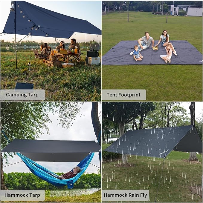 - ✯𝐌𝐮𝐥𝐭𝐢𝐟𝐮𝐧𝐜𝐭𝐢𝐨𝐧 𝐔𝐬𝐞 - Our tent tarp can be a good outdoor campanion that perfect for you use in various occasions.You can not only ues it for camping, traveling, hiking, backpacking, picnicas as sun canopy or rainfly, but also unfold it and lay on ground use as a tent footprint.