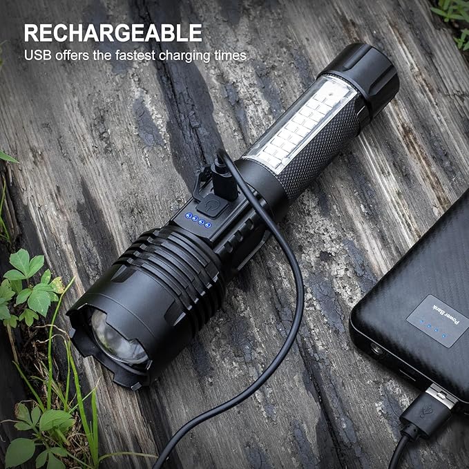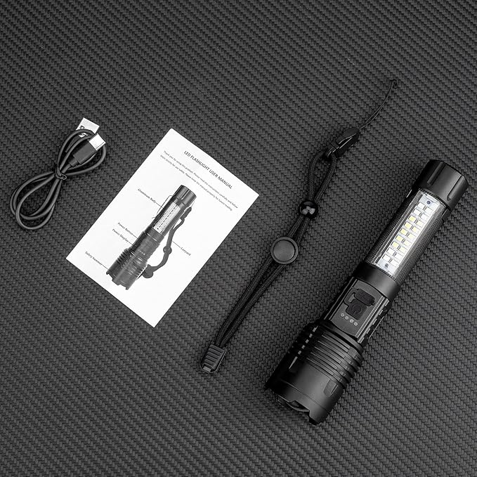 - WHAT YOU WILL GET: Package includes 1* P120-COB Powerful flashlight (Rechargeable ΒATTERY Included), 1* USB Charging Cable, 1* Lanyard, 1* User Manual. The lanyard of the flash light makes it very convenient to carry with you. It's the perfect flashlight for camping, hiking, or everyday use.