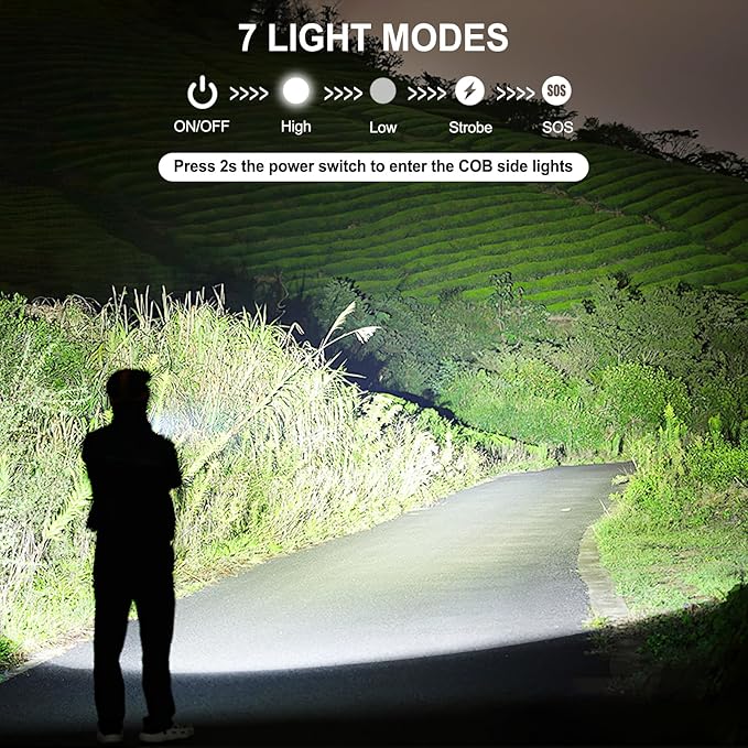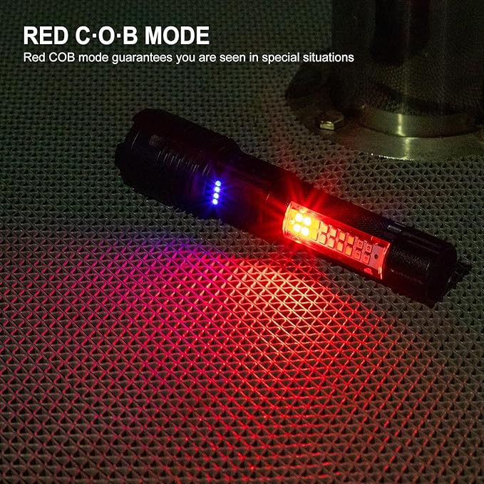 - 7 MODES & ADJUSTABLE FUNCTION: One button control of 7 lighting modes: High/Low/Strobe. Press 2s the power switch to enter the COB side lights: High/Low/Red light/Red and blue warning lights. Furthermore, our flashlights high lumens give you the freedom to choose a narrow or wide beam for long distances or larger illuminated areas.