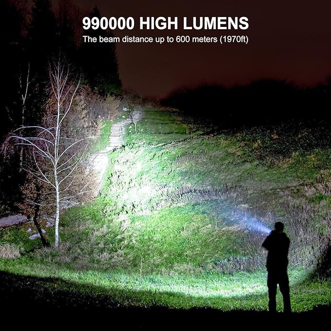 - 990000 LUMEN SUPER BRIGHT: Our rechargeable flashlights high lumens max 990,000-lumen output and 600-meter throw, the high-performance cool white LED provides an impeccable circular spot, lighting up everything in front of you. Widely used for daily lighting, power outages, dog walking, camping, etc.