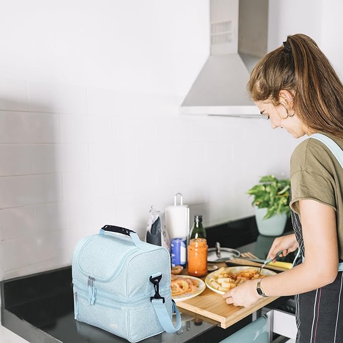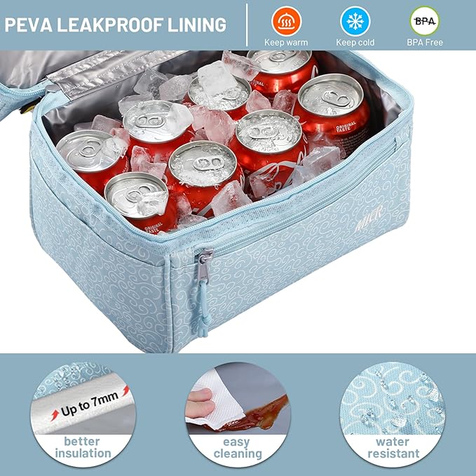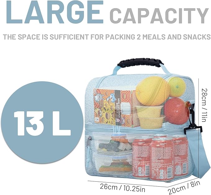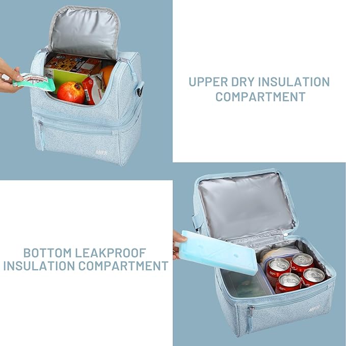 - Insulated Lunch Bag ---- The thick inner insulation and food-grade safe PEVA liner retain coldness or warmth, it can keep food stay cold/warm/fresh for hours, the heat-welded seams to guard against leaks; Easy to wipe clean. Top section interior size is 9.45L*7W*5.5H inch, Bottom section interior size is 9.45L*7W*4.7H inch