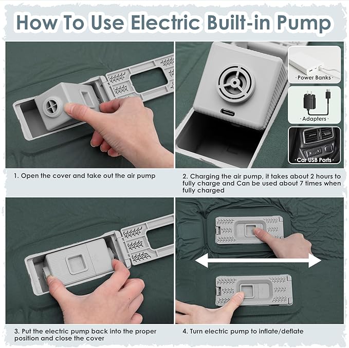 - 【Removable Electric Air Pump】The camping mattress pad comes with Type C charging cable, it can be used for about 7 cycles when fully charged. The recommended maximum charging time is 1-2 hours, and unplug the power cord immediately after charging. Someone should be present when charging at home to avoid overheating of the battery due to prolonged charging, which may pose a safety hazard.
