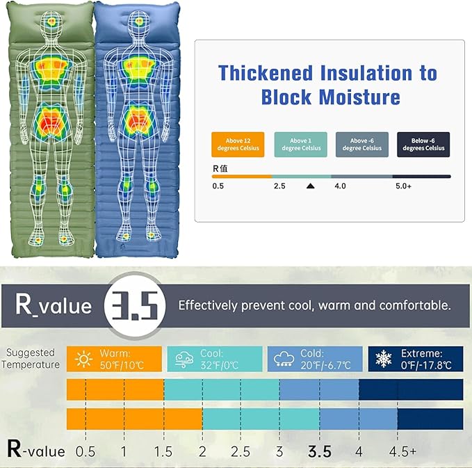 - Thickened 4 in, R-value 3.5 : The inflated size of camping mattress pad is 74.8×25.6×4 in, providing protection from rough surfaces and wet floors. With an R-value of 3.5, our camping mat will keep you warm in cold nights and ensures a comfortable sleep