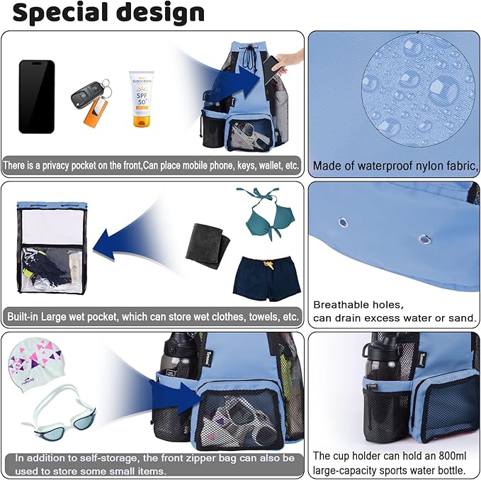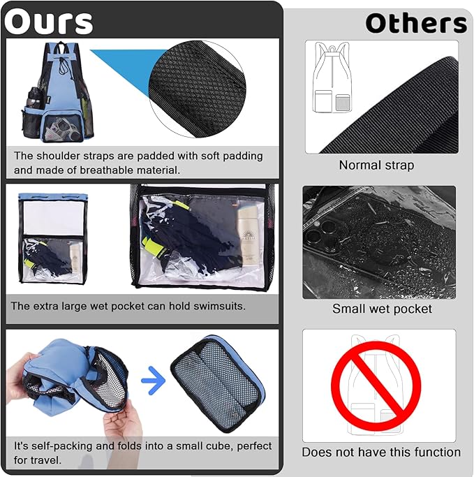 Swim Bag Beach Backpack with Padded Shoulder Strap Mesh Backpack with Wet Pocket for Swimming, Gym
