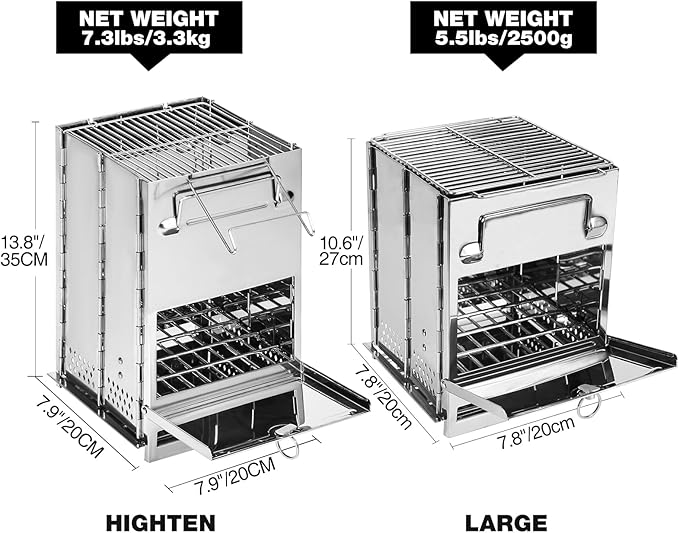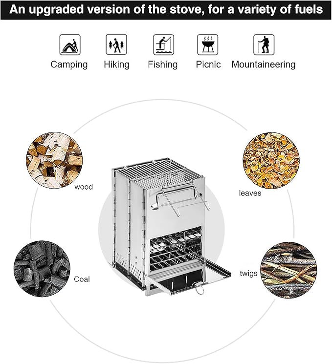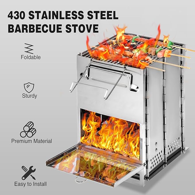 - Backpacking Stove: Eat well wherever adventure takes you with this camping stove wood grill. With a compact foldable design and a durable stainless-steel construction, this small wood stove makes it easy to prepare delicious meals and snacks on-the-go.
