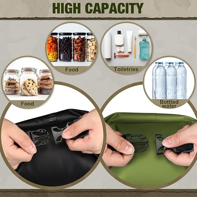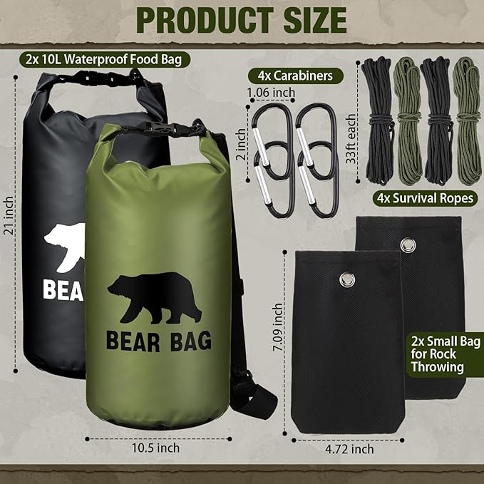 - Bear Food Bag Hanging System: includes 2 bear food bags respectively in black and army green, 4 sturdy nylon ropes in 2 colors, namely black and army green, 4 clips in black, and 2 rock pouches in black; The package ensures you have everything you need for a convenient and efficient setup