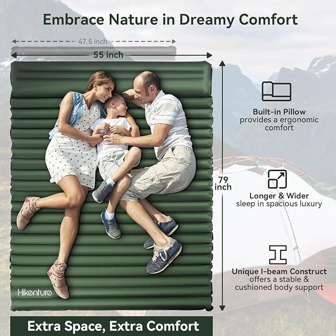 - Embrace Nature in Dreamy Comfort: Say goodbye to sore hips and back, and sleep soundly under the open sky. Hikenture Double Camping Mattress with built-in pillow can inflated to 79*55 inches - a perfect size for 2 very comfy adults. With a 4-inch cozy padding and body support adaptable to all terrains, this sleeping pad guarantees a rejuvenating sleep during your adventures.