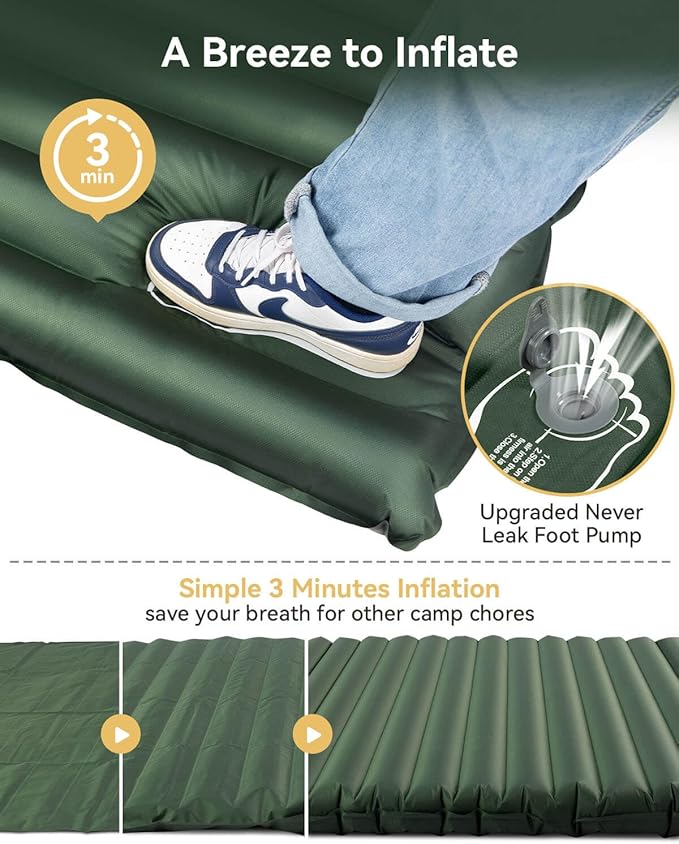 - A Breeze to Inflate / Deflate: Inflate the sleeping pad in 5 minutes with our built-in foot pump. Simply step on the foot pump, lift up, and then push down, keep the process until the pad full with air and you're good to go. Packing up is just as quick - release all the air and roll up the pad, and then put into the storage bag.