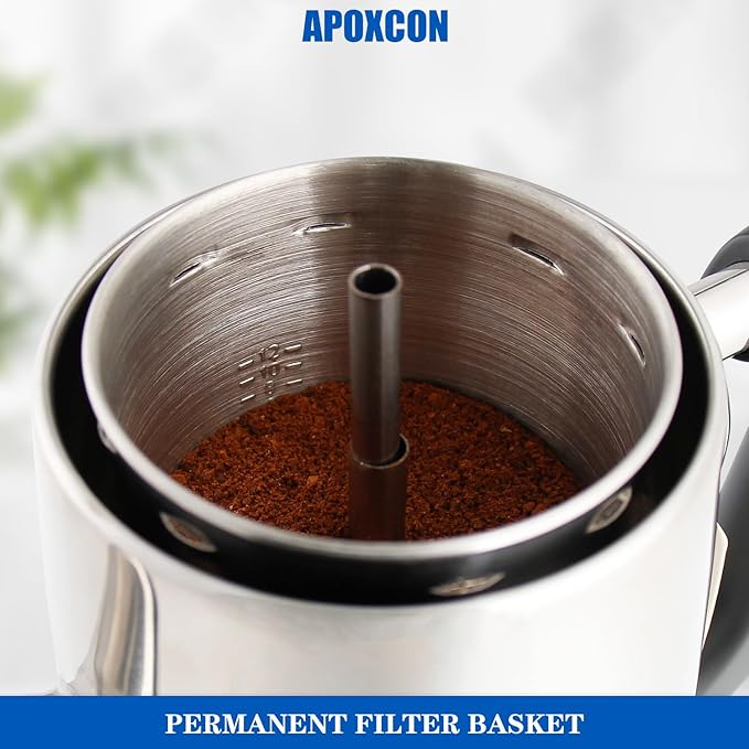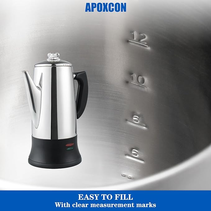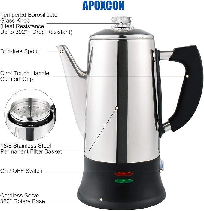 - 【Use Safety】APOXCON electric coffee percolator has passed the ETL certification test, so you can use this coffee percolator with confidence. All parts in contact with coffee are plastic free and aluminum free, providing you and your family with healthy coffee. This percolator coffee pot prioritizes safety during brewing and serving hot coffee.