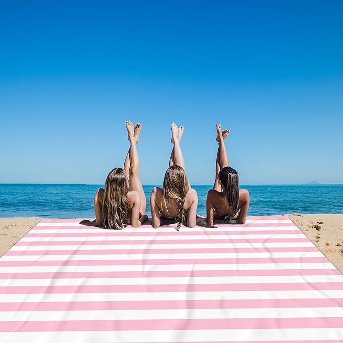 Beach Blanket Sandproof Waterproof, Pink Striped Picnic Blanket Extra Large 9 Ft X 10 Ft for 8 Adults with Stakes and Sand Pocket, Compact Lightweight Sand Free Beach Mat Essential