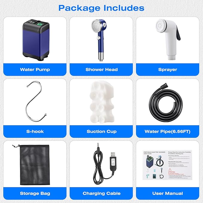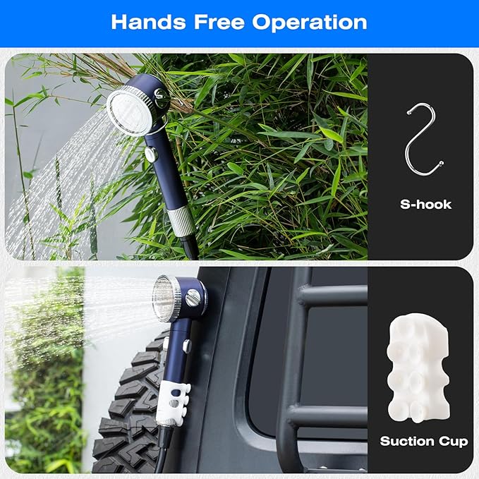 - 【Advanced Shower Pump Technology】Our portable camping shower is powered by a dependable and long-lasting motor that operates quietly, ensuring a serene outdoor shower environment. The adjustable water output allows you to easily switch between high and low flow rates. Strong bottom suction - the water absorption at the bottom is as low as 0.8 mm, no water is wasted.