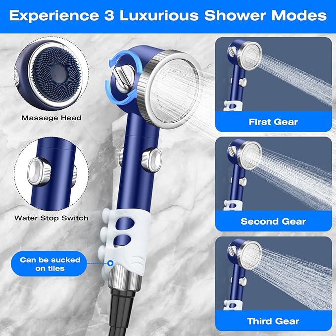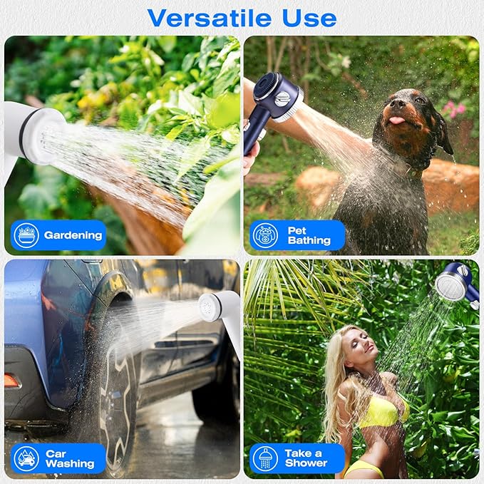 - 【Versatile Functionality 】This portable shower pump with head offers three practical water dispensing settings for a customizable shower experience but also includes an additional white nozzle attachment. This versatile accessory is perfect for a variety of tasks beyond showering, such as watering plants, washing your car, and more.