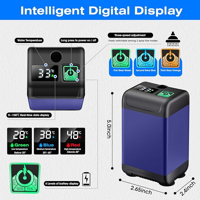 - 【Intelligent Digital Display】Stay in control with our portable water pump's LED display, providing crystal-clear insights into power status and precise water temperature readings from 32 to 212°F. This feature not only prevents heat burns but also ensures you're never left without power mid-shower. Please Note: This camping shower kit has no heating function!