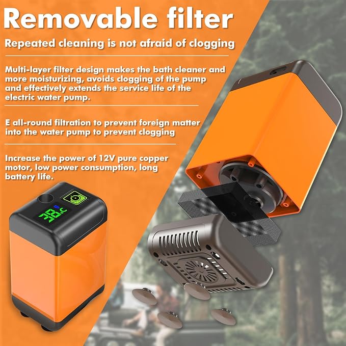 - 【Upgraded Camping Shower Pump】This Outdoor camping shower's bottom suction design with four suction feet on the bottom makes it could be super stable in the water as well as it could absorb water to less than 0.45 inches in height. With a detachable filter, isolate small debris and easy to clean.