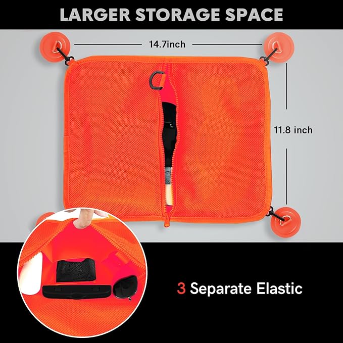 - Enough Storage Space: The paddle board deck Bag is large enough for phone, sandals, water bottles, sunscreen,snacks and sunglasses and so on, Paddle board Mesh Storage Bag size is 11.8”*14.8”. Especially design with 3 separate elastic mesh pockets inside for fixing small gear and a hook for keys.