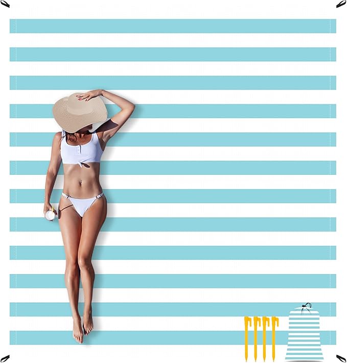 - Windproof Design: Blue stripe beach blanket features four sand pockets and four anchoring stakes. On windy days, sand pockets and 4 stakes keep the wind from billowing underneath if you don't have a lot of stuff on the beach mat. It allows you to enjoy the sun and sea breeze freely.