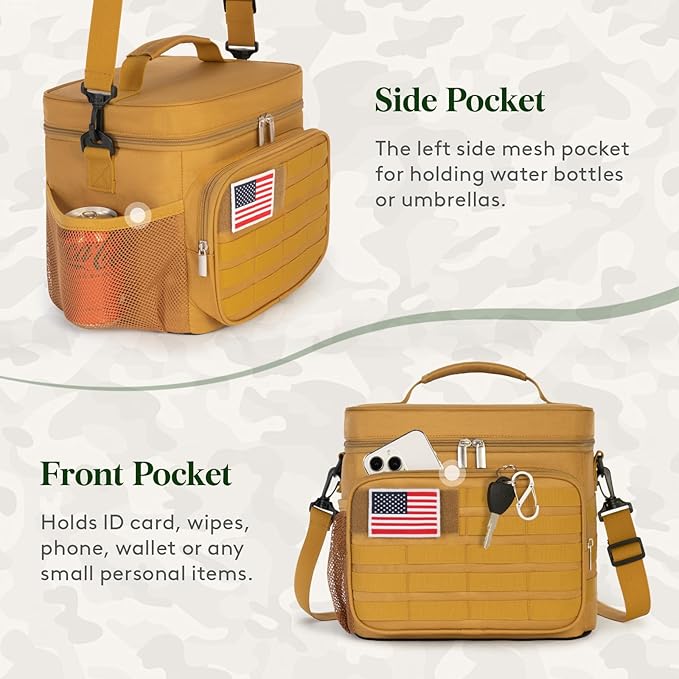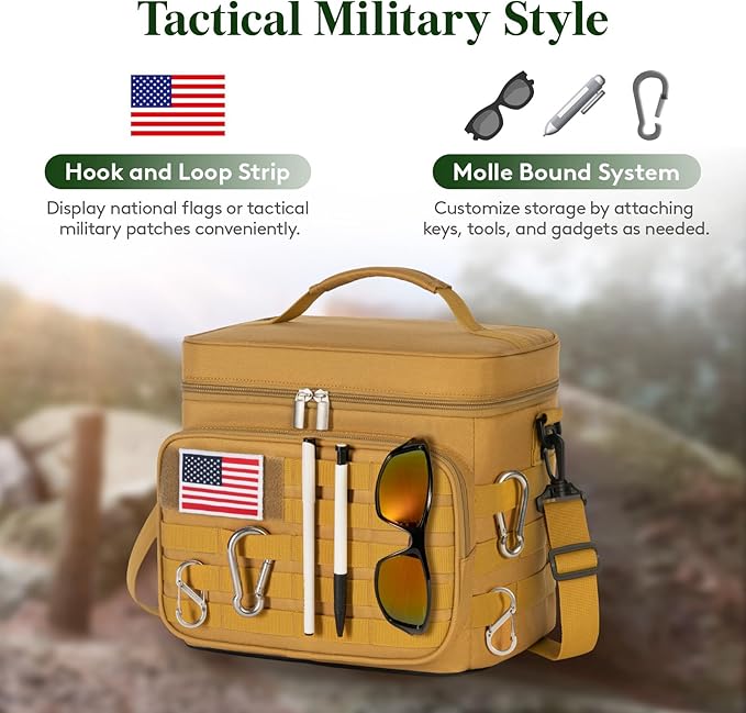 - Tactical Style: Our lunch box for men is perfect for outdoor enthusiasts and military fans. With a classic military-style design featuring MOLLE webbing for extra attachments. The front pocket’s hook and loop strip for displaying national flags or military patches shows your unique style and personality.