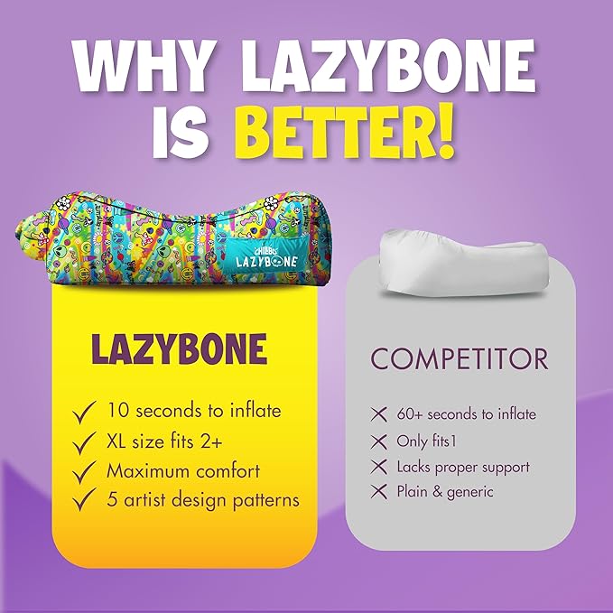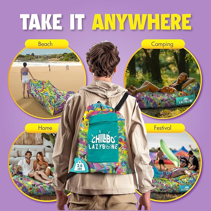 - More Than Just a Lounger: The Lazybone is our greatest innovation yet. No more compromises on uncomfortable inflatable chairs for adults, only inflatable loungers perfect for creating a fully laid-back chill vibe. Chillbo's inflatable beach lounger is crafted for outdoor lovers, by outdoor lovers.