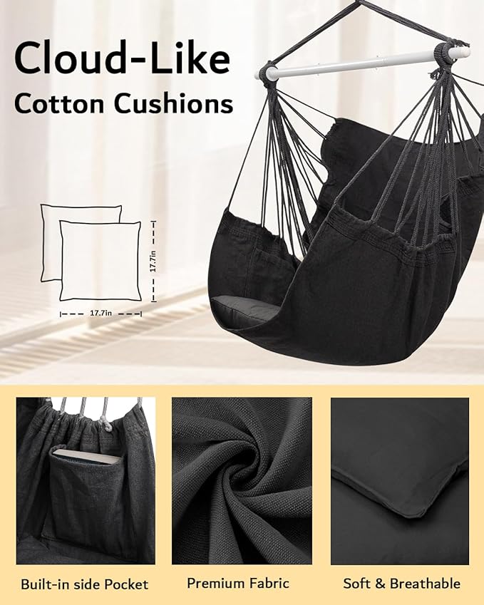 - PET, KID, FAMILY-FRIENDLY FABRIC: Our outdoor hanging chair is tightly woven and constructed with comfortable, long-lasting colorfast cotton thread. Take a break from your stressful day and relax with this soft, sponge-like hammock swing! This lounge chair is easy to set up and designed for long-lasting enjoyment