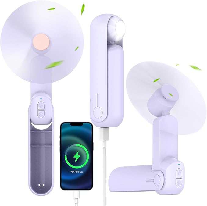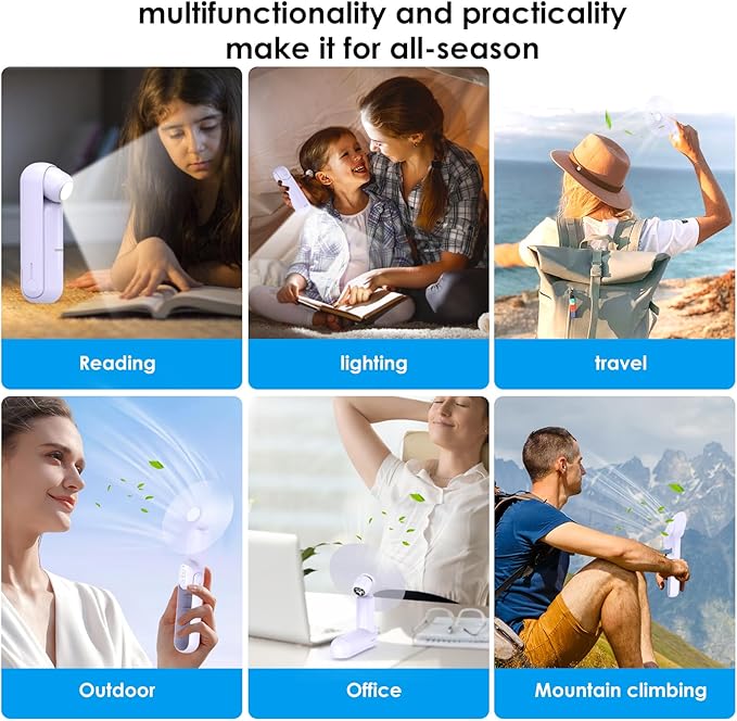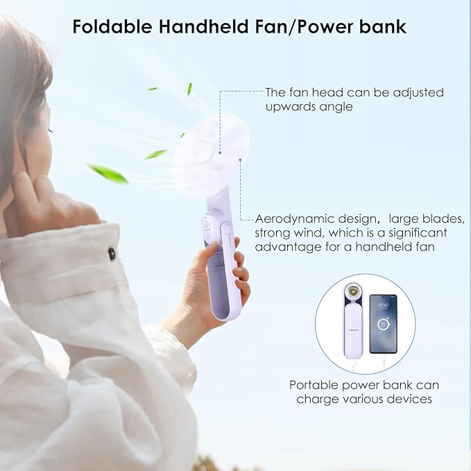 - 【4-in-1 Handheld fan】This 4 in 1 multifunctional handheld fan can be used as a power bank, flashlight, small desktop fan, and mini desk lamp. The aerodynamic design allows it to provide stronger wind,the folding design makes it very fashionable and easy to carry,it's a must-have for both home and travel.