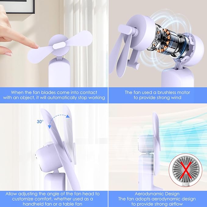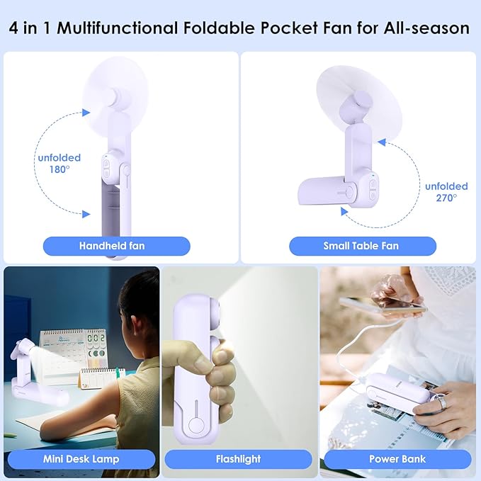 4 IN 1 Portable Handheld Fan,Personal Foldable Cooling Fan, Mini Pocket Fan,Desk Fan,Hand Fan,Flashlight,Power Bank,Table Lamp,Camping Travel Beach Fan, Birthday Gifts for Women Men(Purple)