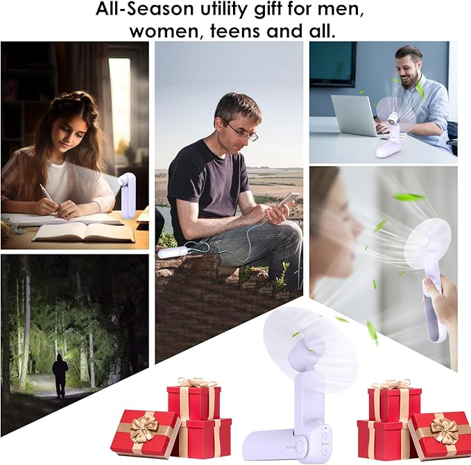 - 【Cool and unique gift】Gifts for people who have everything.This This 4 in 1 multifunctional handheld fan is the best birthday gift,it is also a great Christmas stocking stuffing gifts,perfect for thanksgiving, valentines day,mothers day,fathers day,graduation,anniversary,it's the best gifts for women,men,mom,dad, teens, grandpa,grandma, son, husband, boyfriend. It is practical for everyone, utility gifts for all-season.