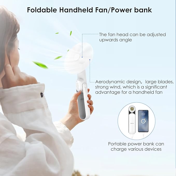 - 【4-in-1 Handheld fan】This 4 in 1 multifunctional handheld fan can be used as a power bank, flashlight, small desktop fan, and mini desk lamp. The aerodynamic design allows it to provide stronger wind,the folding design makes it very fashionable and easy to carry,it's a must-have for both home and travel.