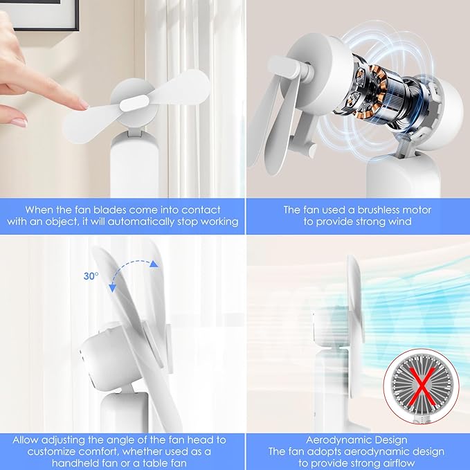 - 【Adjustable direction of wind】Whether you are using it as a handheld fan or a mini desktop fan, the angle of the fan head can be adjusted upwards. When you use it as a desktop fan, adjust the angle of the fan head upwards to allow strong winds to blow onto your face. When you use it as a handheld fan, you don't need to hold your hands high, just adjust the angle of the fan head upwards and let the strong wind blow onto your face, which will make you more comfortable to use.