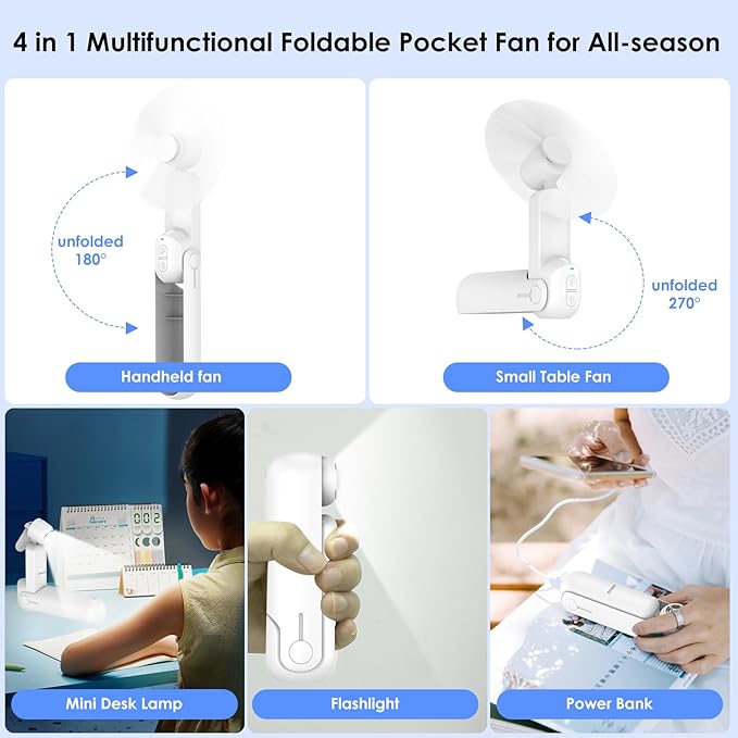 4 IN 1 Portable Handheld Fan,Personal Foldable Cooling Fan, Mini Pocket Fan,Desk Fan,Hand Fan,Flashlight,Power Bank,Table Lamp,Camping Travel Beach Fan, Birthday Gifts for Women Men(White)