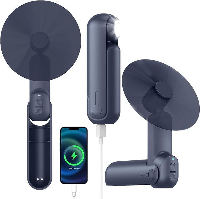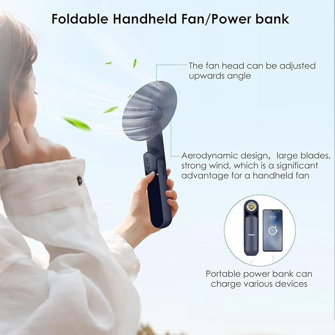 - 【4-in-1 Handheld fan】This 4 in 1 multifunctional handheld fan can be used as a power bank, flashlight, small desktop fan, and mini desk lamp. The aerodynamic design allows it to provide stronger wind,the folding design makes it very fashionable and easy to carry,it's a must-have for both home and travel.