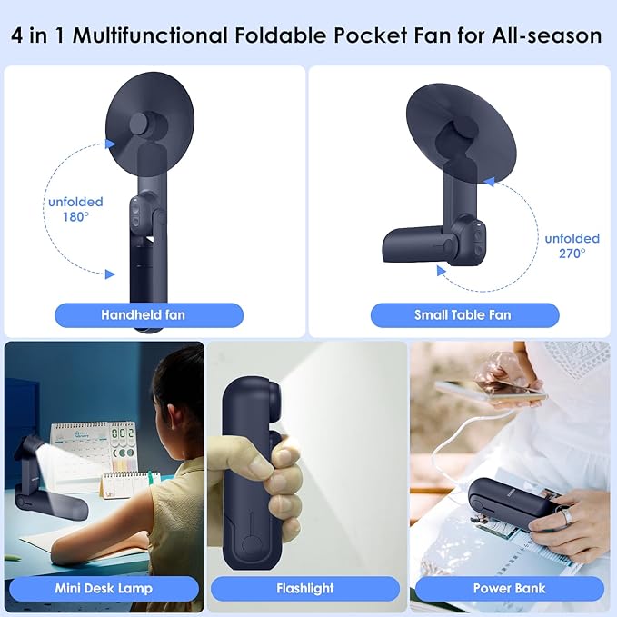 4 IN 1 Portable Handheld Fan,Personal Foldable Cooling Fan, Mini Pocket Fan,Desk Fan,Hand Fan,Flashlight,Power Bank,Table Lamp,Camping Travel Beach Fan, Birthday Gifts for Women Men(Blue)