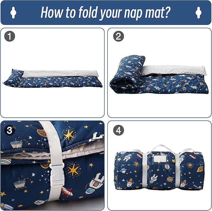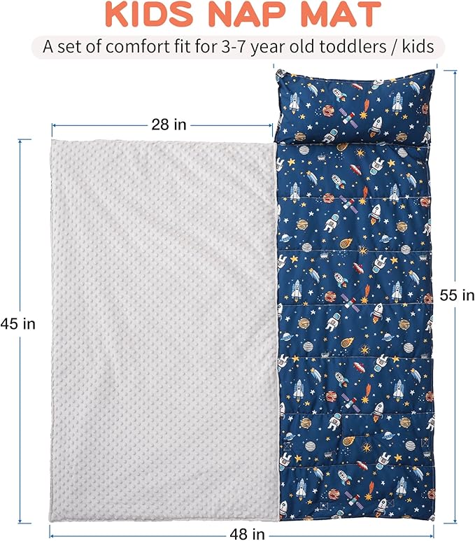 - ALL PURPOSE NAP MATS: The nap mat blanket simplifies life for both parents and kids. This set consists of a built-in sleeping pad, a plush blanket, and a pillow that can be removed when machine washing the mat.
