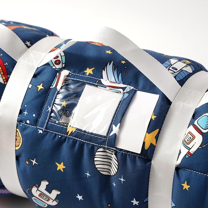 - CONVENIENT FEATURES: Designed to roll-up, velcro close, name card pocket and carry away with a handle, this nap blanket with pillow is easy to carry to daycare, school, on playdates, or on trips. Our padded nap mat is a toddler and baby essential.