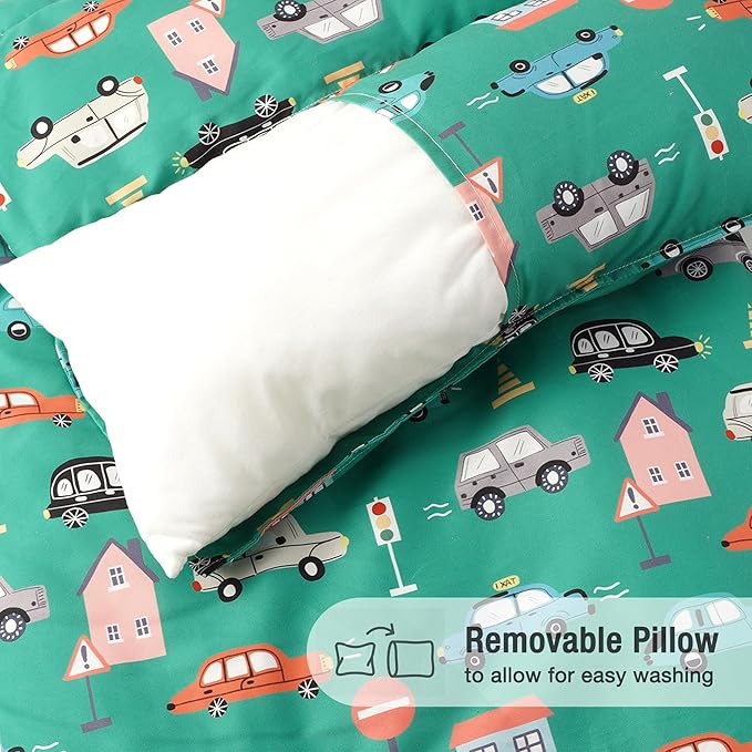 - COMFORTABLE AND WARM: Each lightweight toddler sleeping bag consists of a built-in floor mat, a warm attached blanket, and a pillow - all comprised of a soft cotton and polyester blend that is sure to be gentle on your little one's sensitive skin.