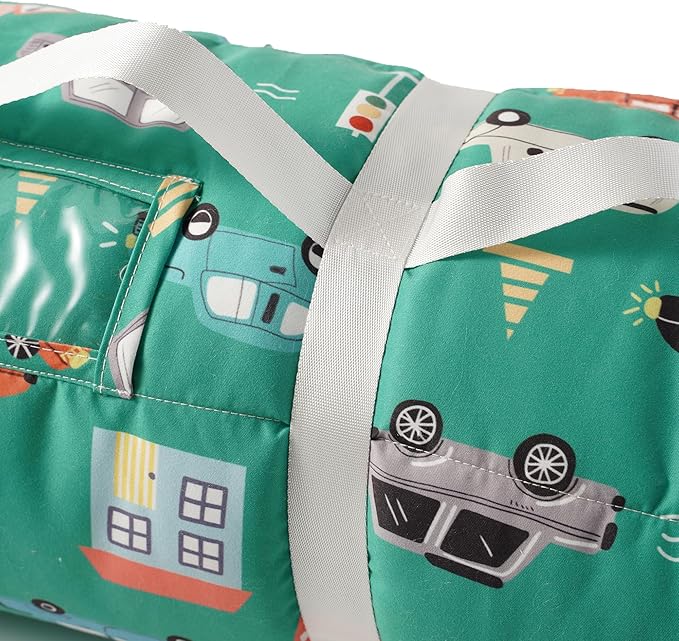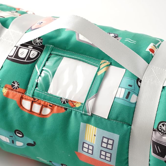 - CONVENIENT FEATURES: Designed to roll-up, velcro close, name card pocket and carry away with a handle, this nap blanket with pillow is easy to carry to daycare, school, on playdates, or on trips. Our padded nap mat is a toddler and baby essential.