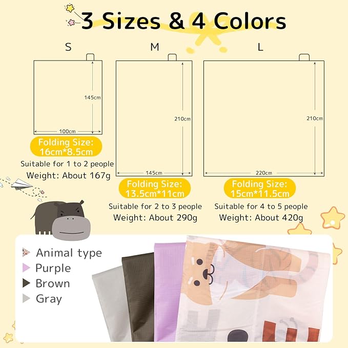 - 【Pocket Size Easy Carry】:Lightweight and can be folded into a small bag and comes with a hand strap for easy storage and carrying.Unfolded size:S(145*100cm,168g)/ M(210*145cm,292g)/ L(220*210cm,421g).
