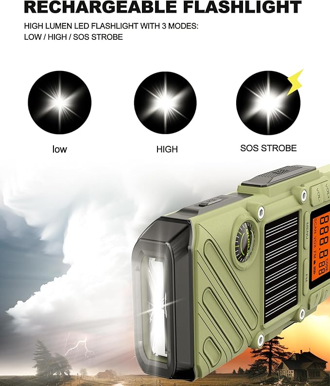- Our multi-function radios feature a high lumen LED flashlight with three different light modes (strobe/high/low) and a convenient keychain clip. The strobe is paired with an SOS siren, perfect for signaling for help in an emergency. It is also perfect for use as a camping light or reading light.