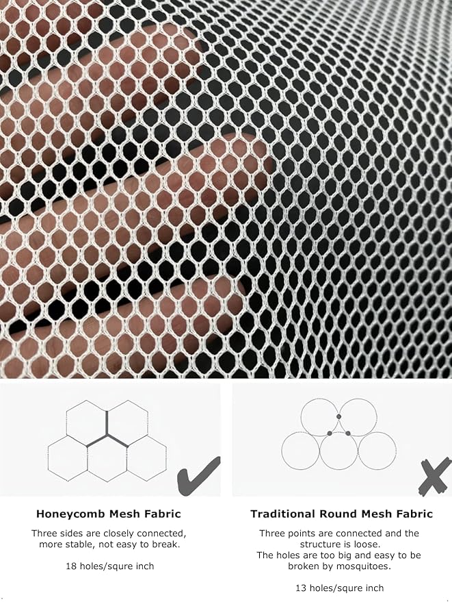 - - The mosquito net is crafted with honeycomb mesh fabric, boasting 18 holes per square inch. This denser design provides enhanced protection compared to traditional nets. It effectively safeguards against mosquitoes and other insects and arachnids like ticks, beetles, flies, and spiders, allowing for a more restful sleep. It's important to note that our net is not impregnated with insecticide.