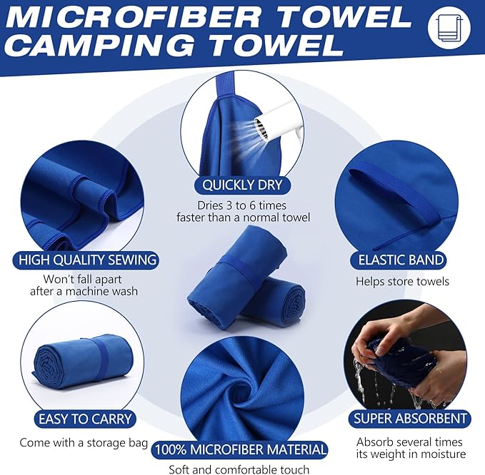 - Absorbent and Quick Drying: made of soft, skin friendly microfiber fabric, the microfiber camping towel is absorbent and quick drying; The water absorption capacity and drying speed are better than ordinary towels; After wiping away sweat, you can spread or hang the quick drying towel to dry