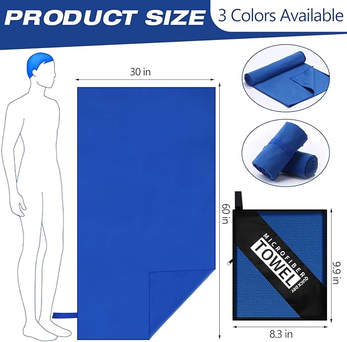 - Multipurpose: microfiber towel set available in 3 colors; The size is about 60 x 30 inches, allows you to use them as a swim towel for drying off, a gym towel for working out, or a small beach towel for vacation to keep you dry and clean during your workout; Suitable for outdoor, swimming, camping, gym, yoga, hiking, backpacking and working out