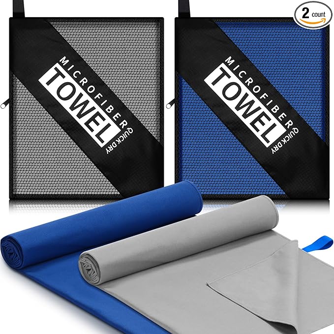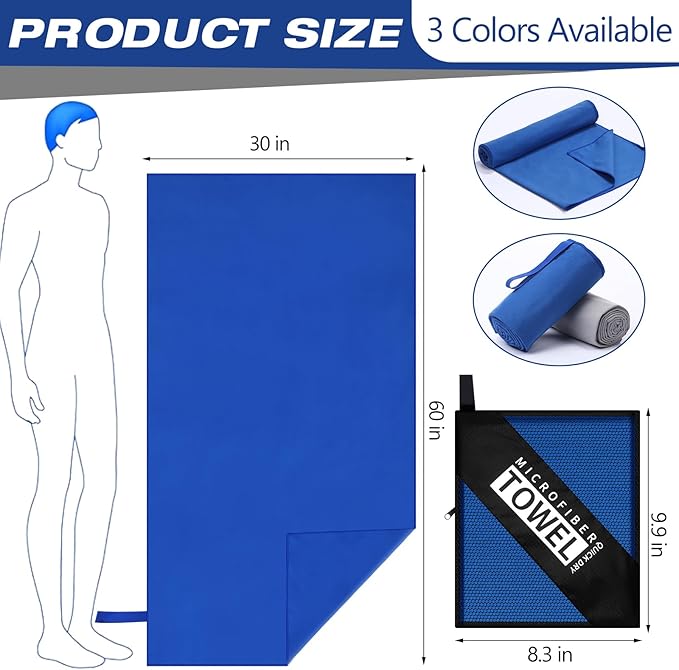 - Multipurpose: microfiber towel set available in 3 colors; The size is about 60 x 30 inches, allows you to use them as a swim towel for drying off, a gym towel for working out, or a small beach towel for vacation to keep you dry and clean during your workout; Suitable for outdoor, swimming, camping, gym, yoga, hiking, backpacking and working out