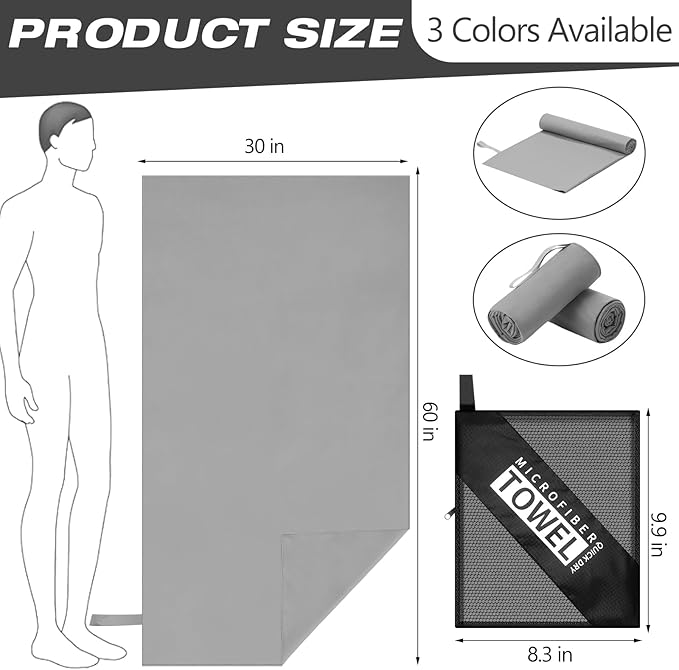 - Multipurpose: microfiber towel set available in 3 colors; The size is about 60 x 30 inches, allows you to use them as a swim towel for drying off, a gym towel for working out, or a small beach towel for vacation to keep you dry and clean during your workout; Suitable for outdoor, swimming, camping, gym, yoga, hiking, backpacking and working out