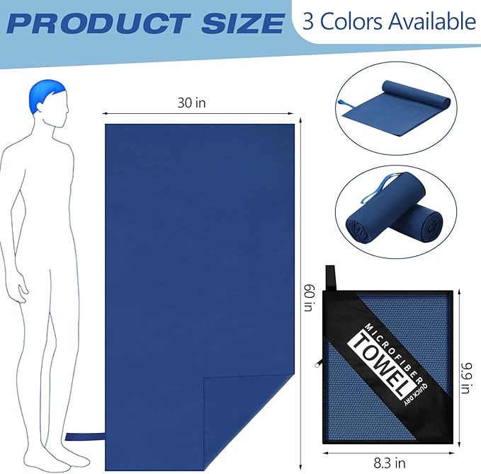 - Multipurpose: microfiber towel set available in 3 colors; The size is about 60 x 30 inches, allows you to use them as a swim towel for drying off, a gym towel for working out, or a small beach towel for vacation to keep you dry and clean; Suitable for outdoor, swimming, camping, gym, yoga, hiking, backpacking and working out