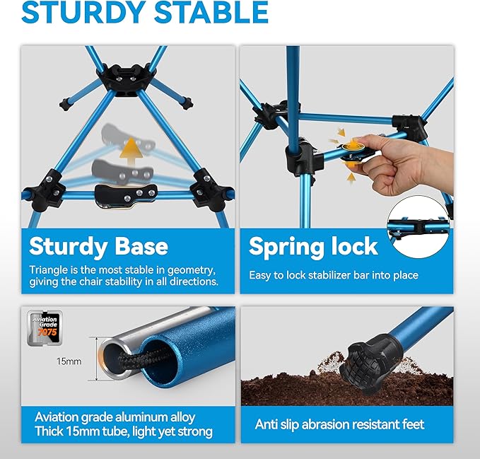 - Ultralight & Compact: Frame is made of aircraft-grade aluminum alloy, ultralight yet highly capable, weighing just 2.7 pounds. It folds up into its own carry case that only takes up about 1/3 the space of regular camp chairs and can fit in a backpack or attach to a day pack, making it easy to carry with you at all times. Ideal for outdoor activities where space and weight are limited.