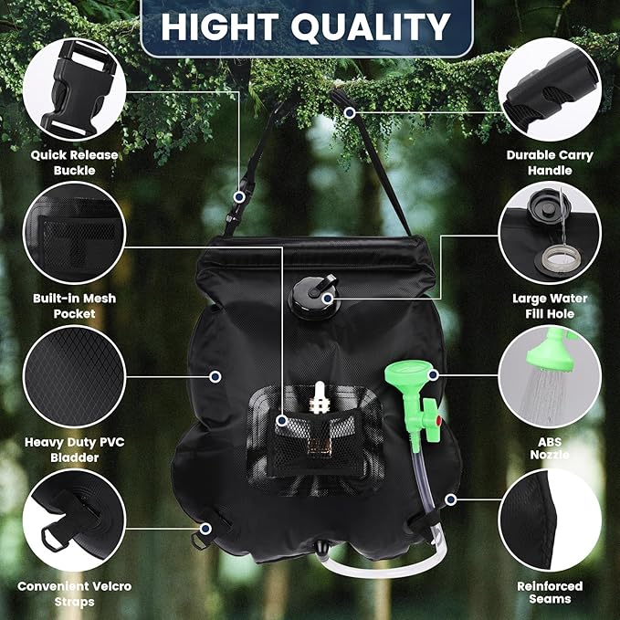 - Tough and Reliable: The portable camp shower is made of heavy-duty PVC material, Easily hang the portable shower bag using the sturdy handle on trees or other supports at your preferred height and simply fill with water, hang in an area with plenty of sunshine, and enjoy a warm shower easily!