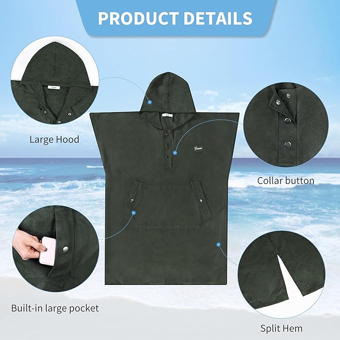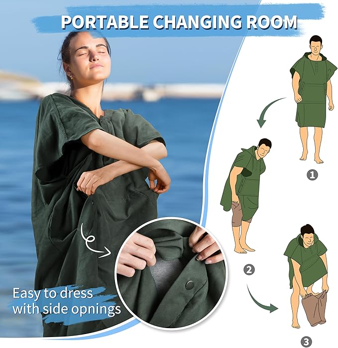 - Portable Changing Room: Engineered for convenience and privacy, our surfing poncho serves as your very own portable dressing space. Equipped with strategic side openings and a change hole, transitioning from swimwear to streetwear becomes a breeze. The quick-dry fabric ensures you stay comfortable while changing clothes, whether you're slipping out of your wetsuit or into your outfit. Snap-button closures at the neckline allow for swift adjustments, making every change as smooth and swift as