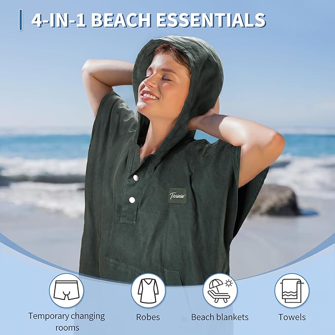 - 4-in-1 Beach Essential: Our multifacational pullover surf poncho is a quintessential companion for any beach enthusiast. Effortlessly transitioning from a cozy towel to a chic robe, it further extends its utility as a spacious beach mat. But its true innovation shines through as a mobile changing station, perfect for slipping into your swim gear, diving attire, or kayaking essentials with ease and privacy. Whether you're preparing for a dive or drying off post-swim, this sandcloud poncho is your