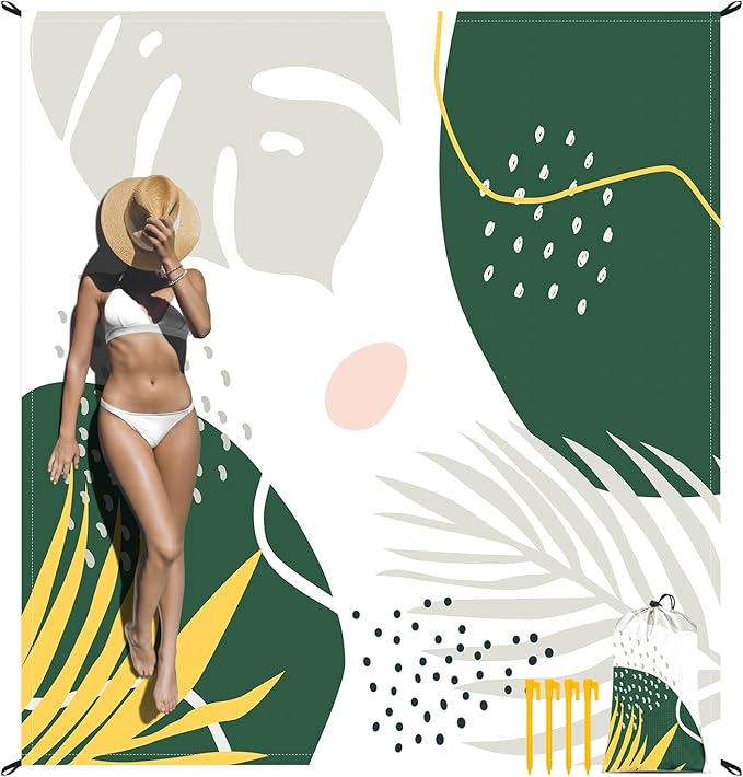 - Welcome Windy Days - Our minimalist leaves waterproof sand-free beach mat will change the way you enjoy the beach. 4 stakes help you keep the large beach blanket firmly in the ground, so it doesn’t fly around and keep the sand off your food when windy. Enjoy an oversized sand free beach mat for total fun and leisure