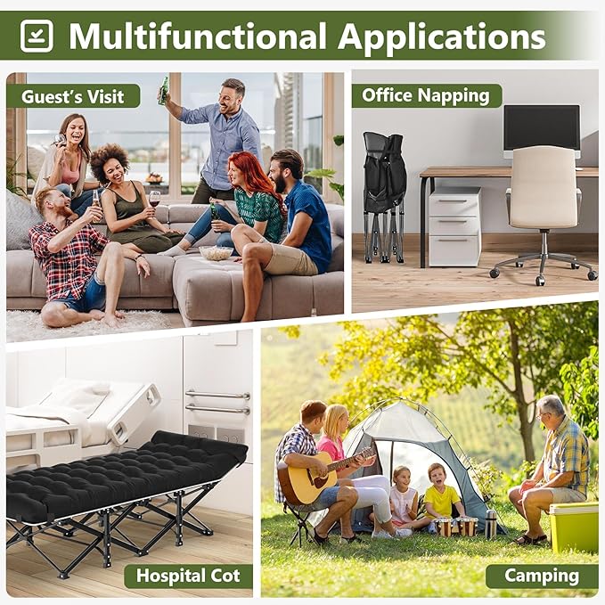 • 【Comfort】Camp cots are typically used for short-term purposes, come equipped with suitable mattresses and support structures, friends visiting can be used as a temporary sleeping bed to ensure users have a good sleep experience.