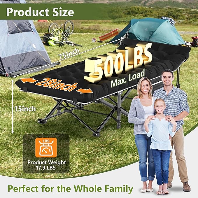 Slendor Camping Cot, Folding Camping Cots for Adults, Portable Sleeping Cot with Carry Bag, 1200D Double Layer Oxford, Camp Cot Bed for Guest Travel, Hiking, Support 500lbs, Black